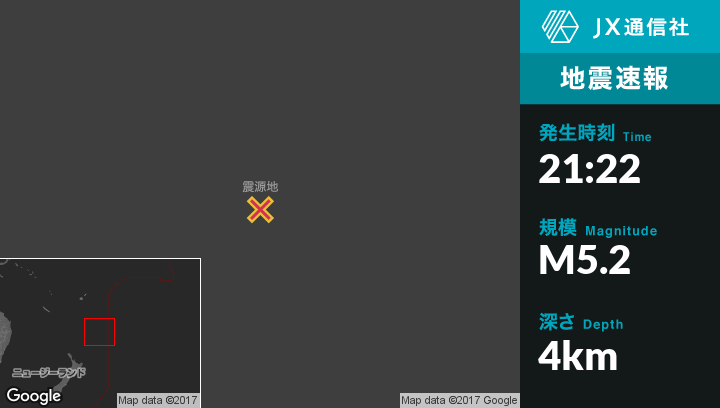 4月30日 21:22頃、ニュージーランドのRaoul Islandから東235kmの地点でM5.2の地震がありました。