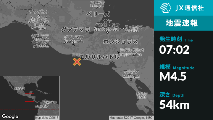 | 震源地 | エルサルバドルのSan Francisco Menendezから南西45kmの地点 |