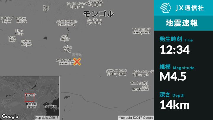 7月04日 12:34頃、モンゴルのHatansuudalから東南東52kmの地点でM4.5の地震がありました。
