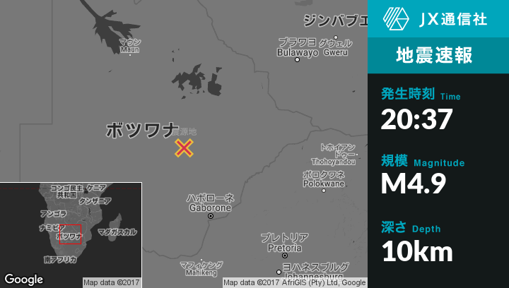 | 震源地 | ボツワナのLetlhakaneから南南西137kmの地点 |