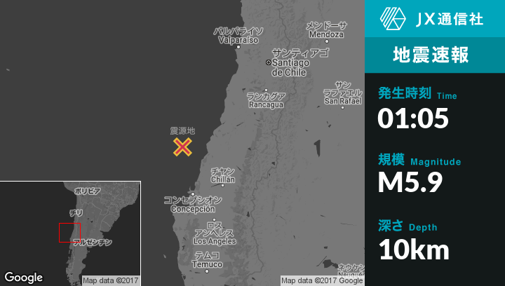 7月05日 01:05頃、チリのConstitucionから西南西89kmの地点でM5.9の地震がありました。