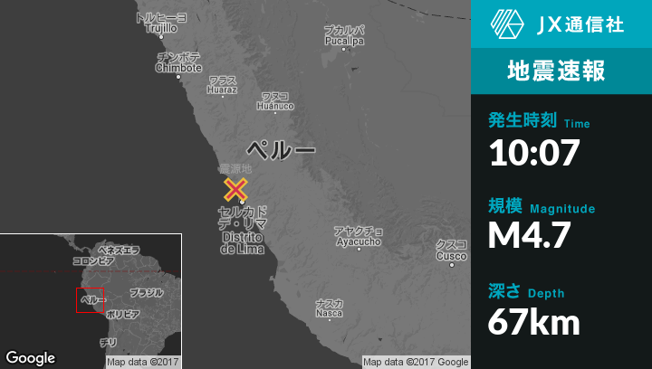 7月09日 10:07頃、ペルーのChancayから南東9kmの地点でM4.7の地震がありました。