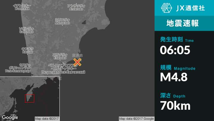 8月03日 06:05頃、ロシアのPetropavlovsk-Kamchatskiyから東72kmの地点でM4.8の地震がありました。