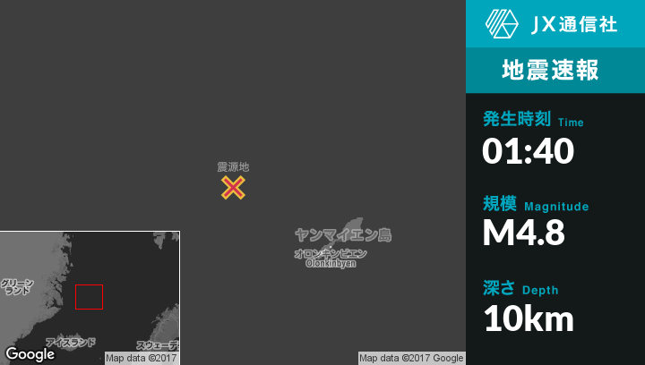 | 震源地 | スヴァールバルとヤン・マイエンのOlonkinbyenから北西103kmの地点 |
