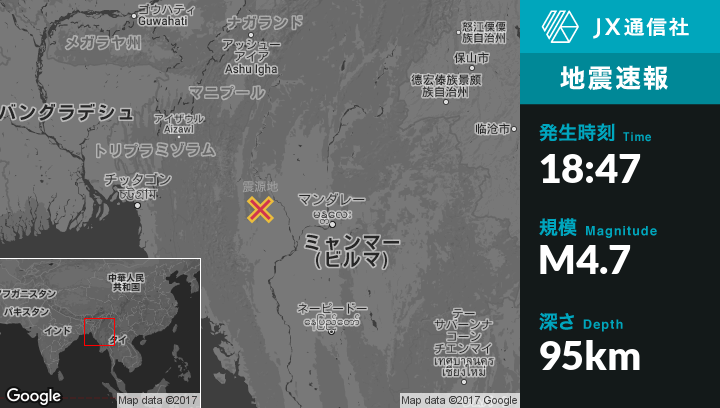 | 震源地 | ミャンマーのMonywaから西北西69kmの地点 |