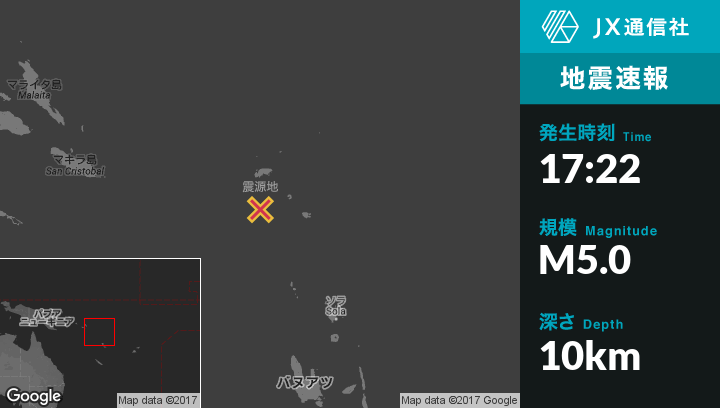 12月28日 17:22頃、ソロモン諸島のLataから南76kmの地点でM5.0の地震がありました。