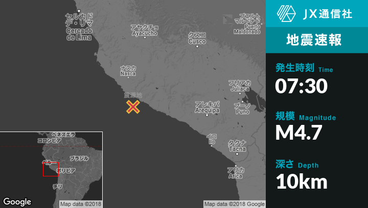 2月06日 07:30頃、ペルーのAcariから南南西57kmの地点でM4.7の地震がありました。