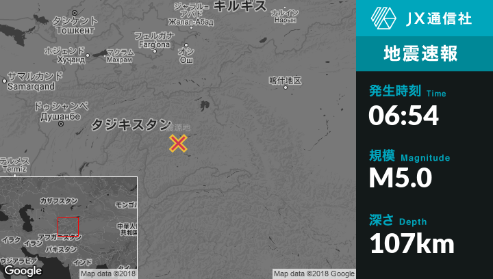 2月07日 06:54頃、タジキスタンのVanjから東南東98kmの地点でM5.0の地震がありました。