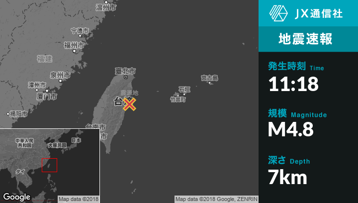 2月07日 11:18頃、台湾のHualianから東北東14kmの地点でM4.8の地震がありました。