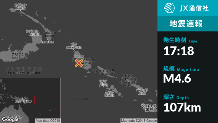 3月11日 17:18頃、パプアニューギニアのPangunaから西49kmの地点でM4.6の地震がありました。