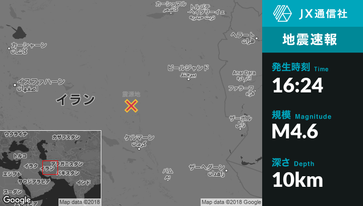 3月16日 16:24頃、イランのRavarから北80kmの地点でM4.6の地震がありました。