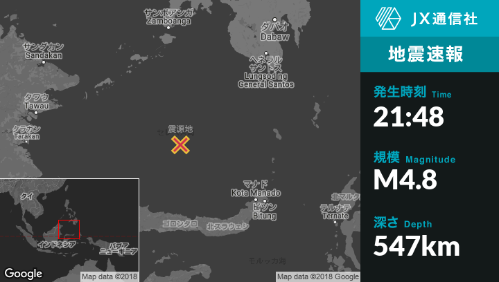 3月17日 21:48頃、インドネシアのKaliから北北東265kmの地点でM4.8の地震がありました。