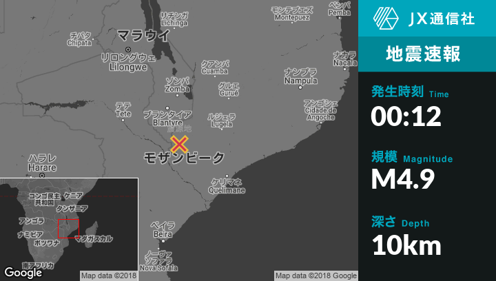3月18日 00:12頃、マラウイのNsanjeから北東22kmの地点でM4.9の地震がありました。