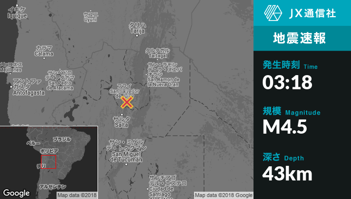 3月18日 03:18頃、アルゼンチンのPalpalaから北北東9kmの地点でM4.5の地震がありました。