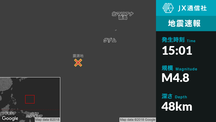 3月18日 15:01頃、グアムのMerizo Villageから西南西280kmの地点でM4.8の地震がありました。