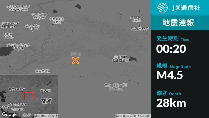 3月20日 00:20頃、中国のKuqaから北北西33kmの地点でM4.5の地震がありました。