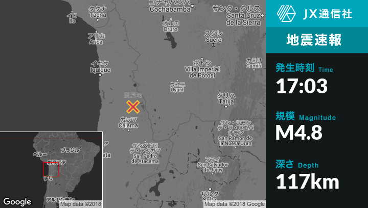 3月22日 17:03頃、チリのCalamaから北119kmの地点でM4.8の地震がありました。