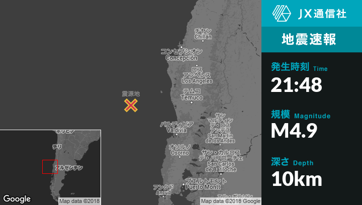 3月22日 21:48頃、チリのCarahueから西181kmの地点でM4.9の地震がありました。