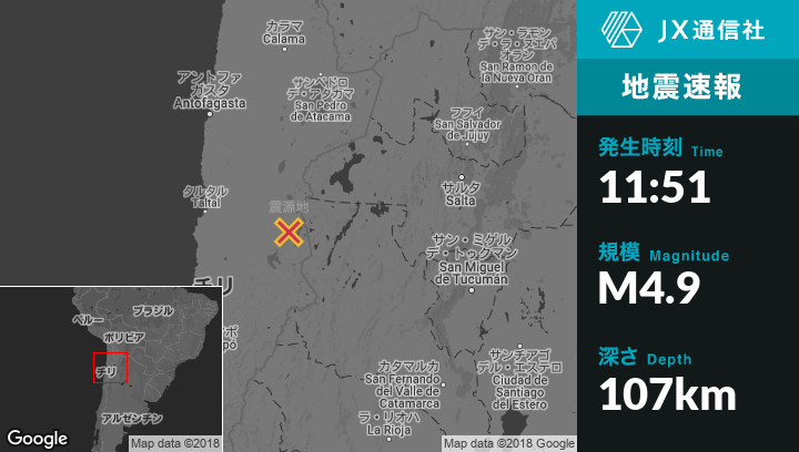 3月24日 11:51頃、チリのDiego de Almagroから東北東144kmの地点でM4.9の地震がありました。