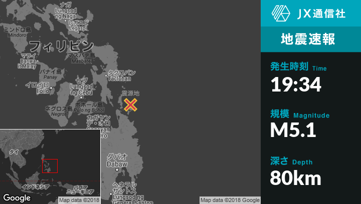 3月24日 19:34頃、フィリピンのSanta Monicaから北12kmの地点でM5.1の地震がありました。