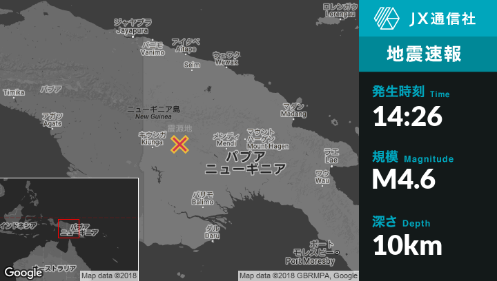 3月25日 14:26頃、パプアニューギニアのKiungaから東北東99kmの地点でM4.6の地震がありました。