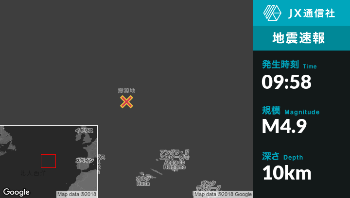 3月28日 09:58頃、ポルトガルのSanta Cruz das Floresから北東239kmの地点でM4.9の地震がありました。