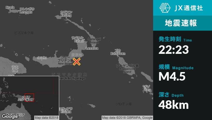 4月03日 22:23頃、パプアニューギニアのKimbeから東162kmの地点でM4.5の地震がありました。