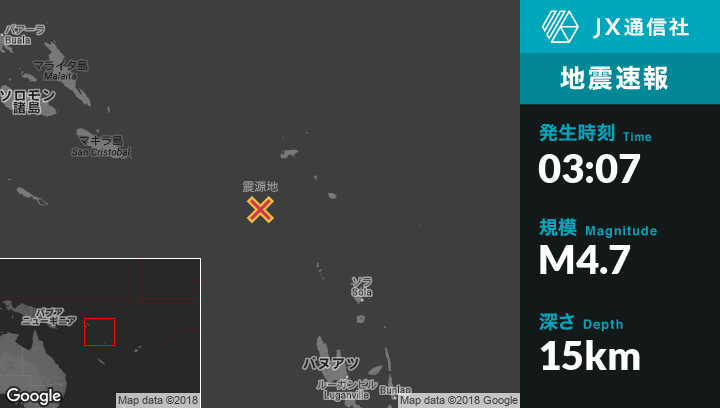 4月22日 03:07頃、ソロモン諸島のLataから南南西136kmの地点でM4.7の地震がありました。