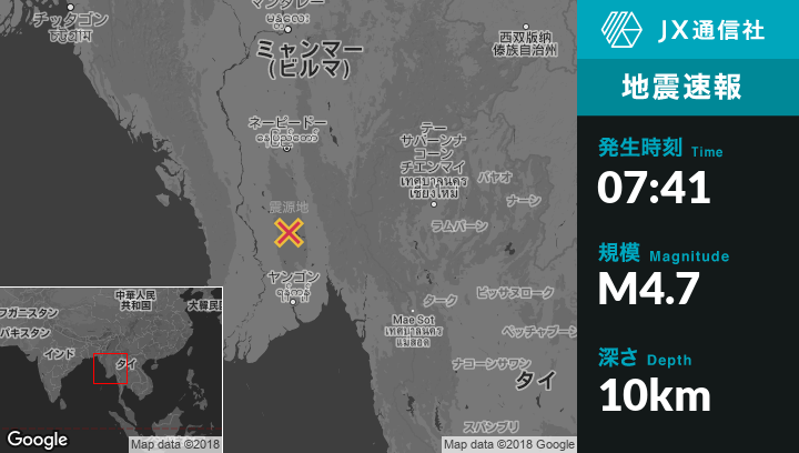4月22日 07:41頃、ミャンマーのPyuから西南西41kmの地点でM4.7の地震がありました。