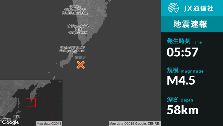 4月24日 05:57頃、ロシアのSevero-Kuril'skから南東64kmの地点でM4.5の地震がありました。