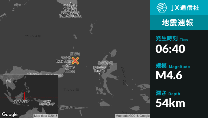 4月24日 06:40頃、インドネシアのBitungから北東60kmの地点でM4.6の地震がありました。