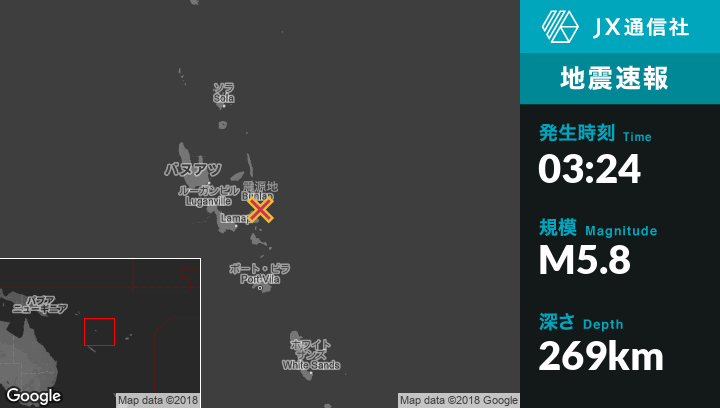 5月01日 03:24頃、バヌアツのLakatoroから東99kmの地点でM5.8の地震がありました。
