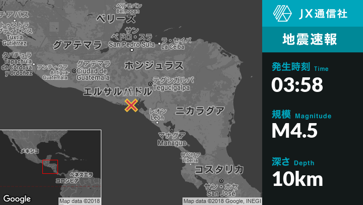 5月07日 03:58頃、エルサルバドルのIntipucaから北北東10kmの地点でM4.5の地震がありました。