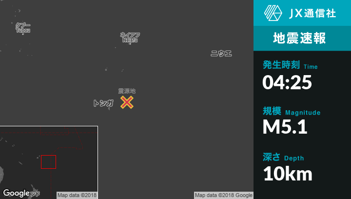 | 震源地 | トンガの`Ohonuaから東北東91kmの地点 |