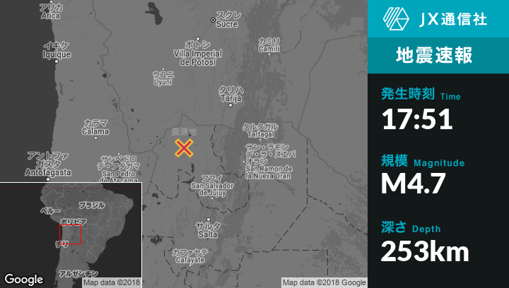 | 震源地 | アルゼンチンのAbra Pampaから西49kmの地点 |