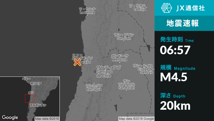 5月12日 06:57頃、チリのValparaisoから北西45kmの地点でM4.5の地震がありました。