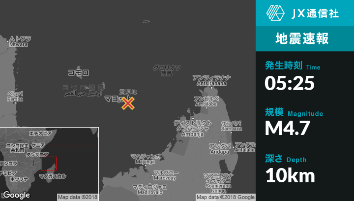 | 震源地 | マヨットのPamandziから東南東30kmの地点 |