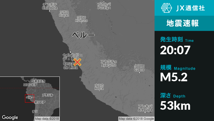 5月17日 20:07頃、ペルーのMalaから東7kmの地点でM5.2の地震がありました。