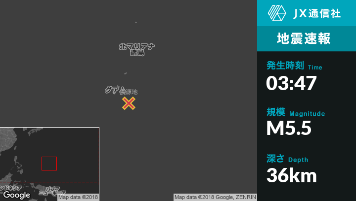 5月18日 03:47頃、グアムのInarajan Villageから東南東71kmの地点でM5.5の地震がありました。