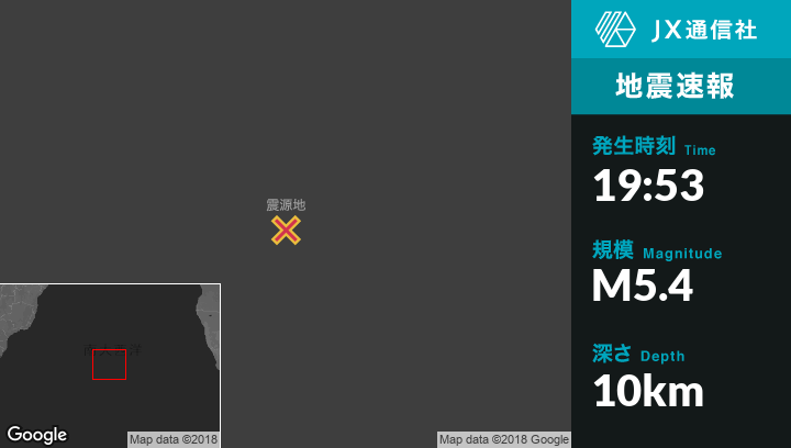 5月18日 19:53頃、セントヘレナのEdinburgh of the Seven Seasから北西542kmの地点でM5.4の地震がありました。