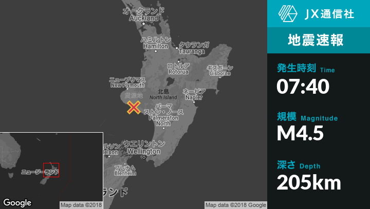 5月20日 07:40頃、ニュージーランドのHaweraから北東4kmの地点でM4.5の地震がありました。