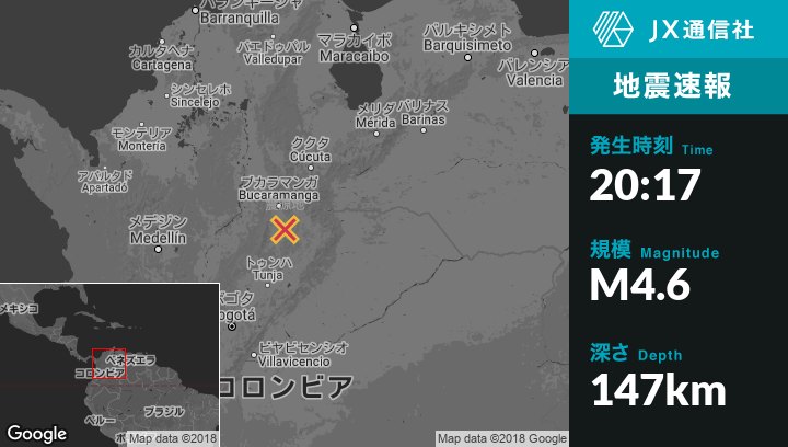 | 震源地 | コロンビアのAratocaから北北東8kmの地点 |