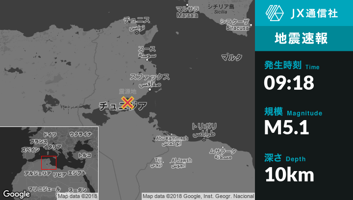 | 震源地 | チュニジアのAl Mazzunahから南南西26kmの地点 |