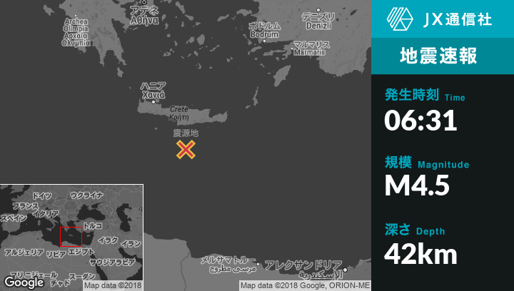 5月25日 06:31頃、ギリシャのPirgosから南南西66kmの地点でM4.5の地震がありました。