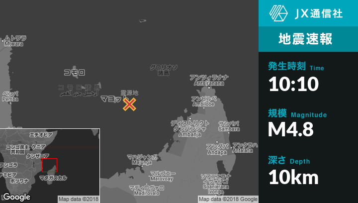 5月31日 10:10頃、マヨットのPamandziから東南東53kmの地点でM4.8の地震がありました。
