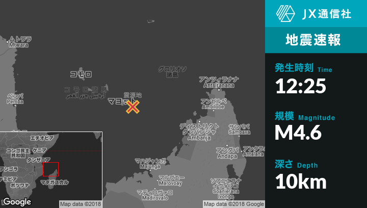 6月03日 12:25頃、マヨットのPamandziから東南東33kmの地点でM4.6の地震がありました。
