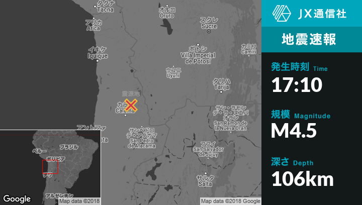 6月03日 17:10頃、チリのCalamaから北北東62kmの地点でM4.5の地震がありました。