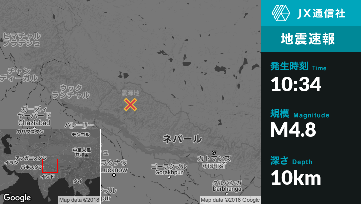 6月05日 10:34頃、ネパールのJumlaから北西67kmの地点でM4.8の地震がありました。
