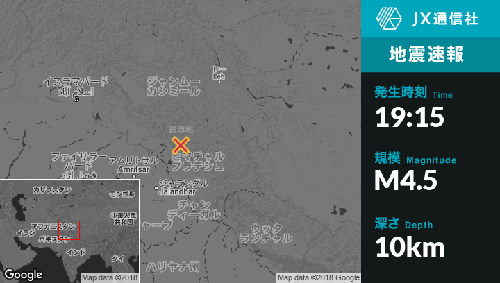 6月14日 19:15頃、インドのChambaから東21kmの地点でM4.5の地震がありました。