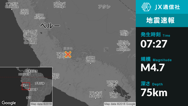 6月15日 07:27頃、ペルーのAynaから東南東6kmの地点でM4.7の地震がありました。